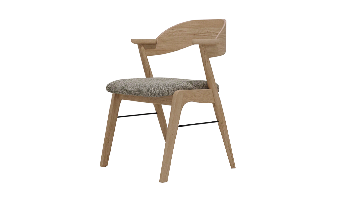 CLUTE CHAIR CLUTE AboutCLUTE木の温もりをダイレクトに感じられるオーク無垢材のフレームと、広めの座面が特徴的な、デザイン性と機能性を兼ね備えたチェア。肘掛けが短めに設計されているハーフアームタイプなので、椅子を後ろに大きく引かなくても横からサッと立ち座りができます。 material: オーク,ウレタン,アイアン ウレタン塗装 W525*D560*H712(SH450) ¥35,000(in tax) この商品について問い合わせる