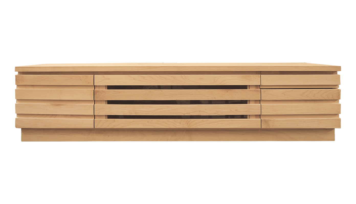 横方向に揃えた前板のデザインが、空間に広がりと落ち着きをもたらします。中央部はスリット仕様となっており、閉じたままでも機器操作がしやすい設計。収納力にも優れ、リビングまわりをすっきりと整えます。