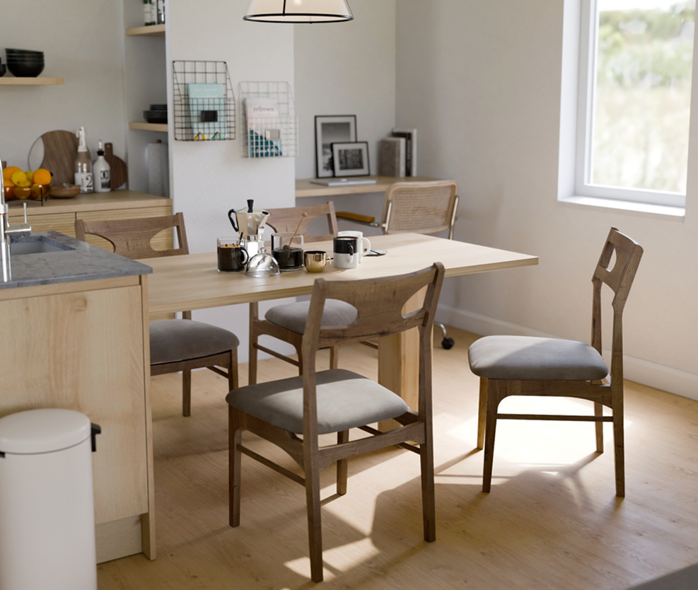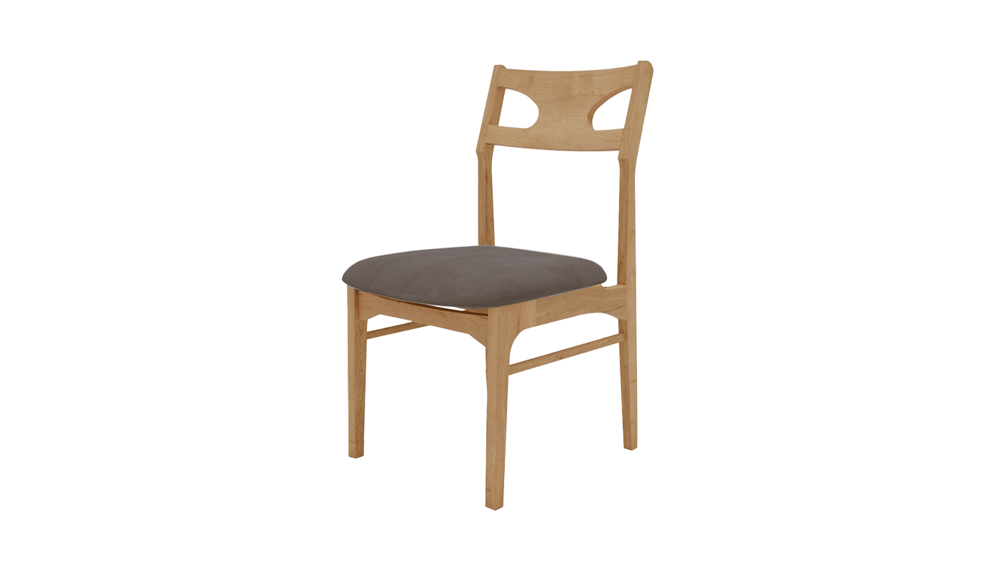 直線と緩やかな曲線をバランスよく組み合わせたフォルムは、ミッドセンチュリーのレトロな趣を感じさせながらも、現代のインテリアに自然に溶け込みます。フレームにはオーク材を使用し、木目の美しさと素材本来の温かみを引き立てる仕上がりです。