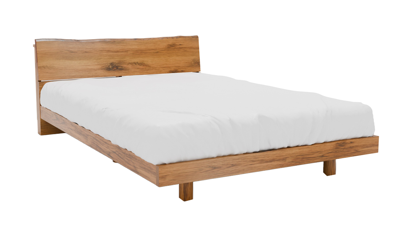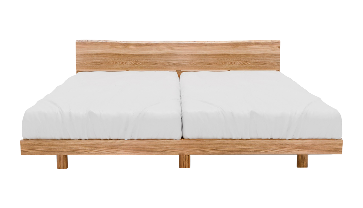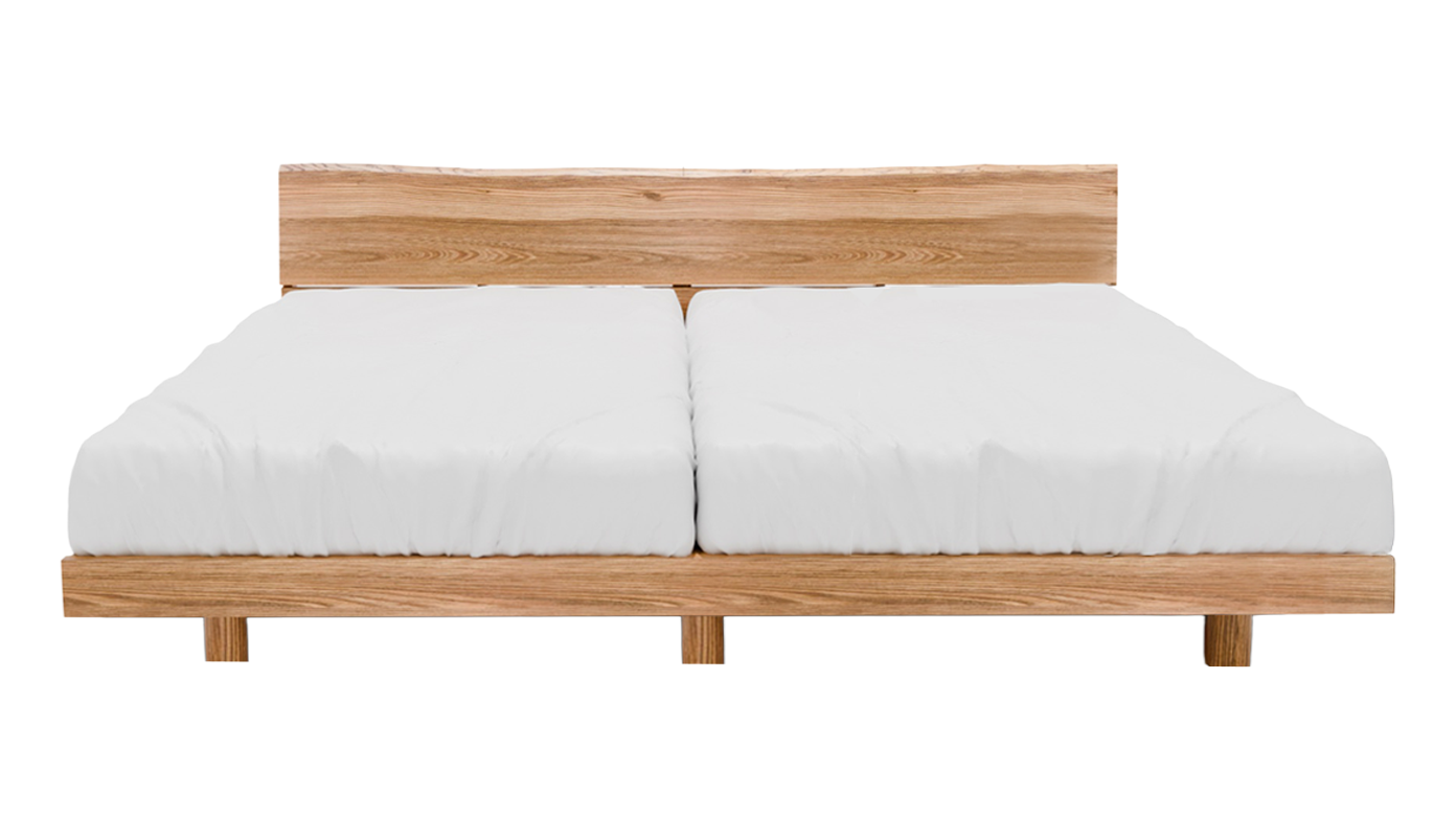 ヘッドボードには無垢材を使用し、木そのものの風合いや力強い木目を活かした仕上がり。樹種によって印象が変わるため、空間や好みに合わせてお選びいただけます。ヘッドボード上部に施された波打ち加工が、人工的になりすぎない天然木らしい表情を生み出し、空間にやさしく自然な印象を与えます。
