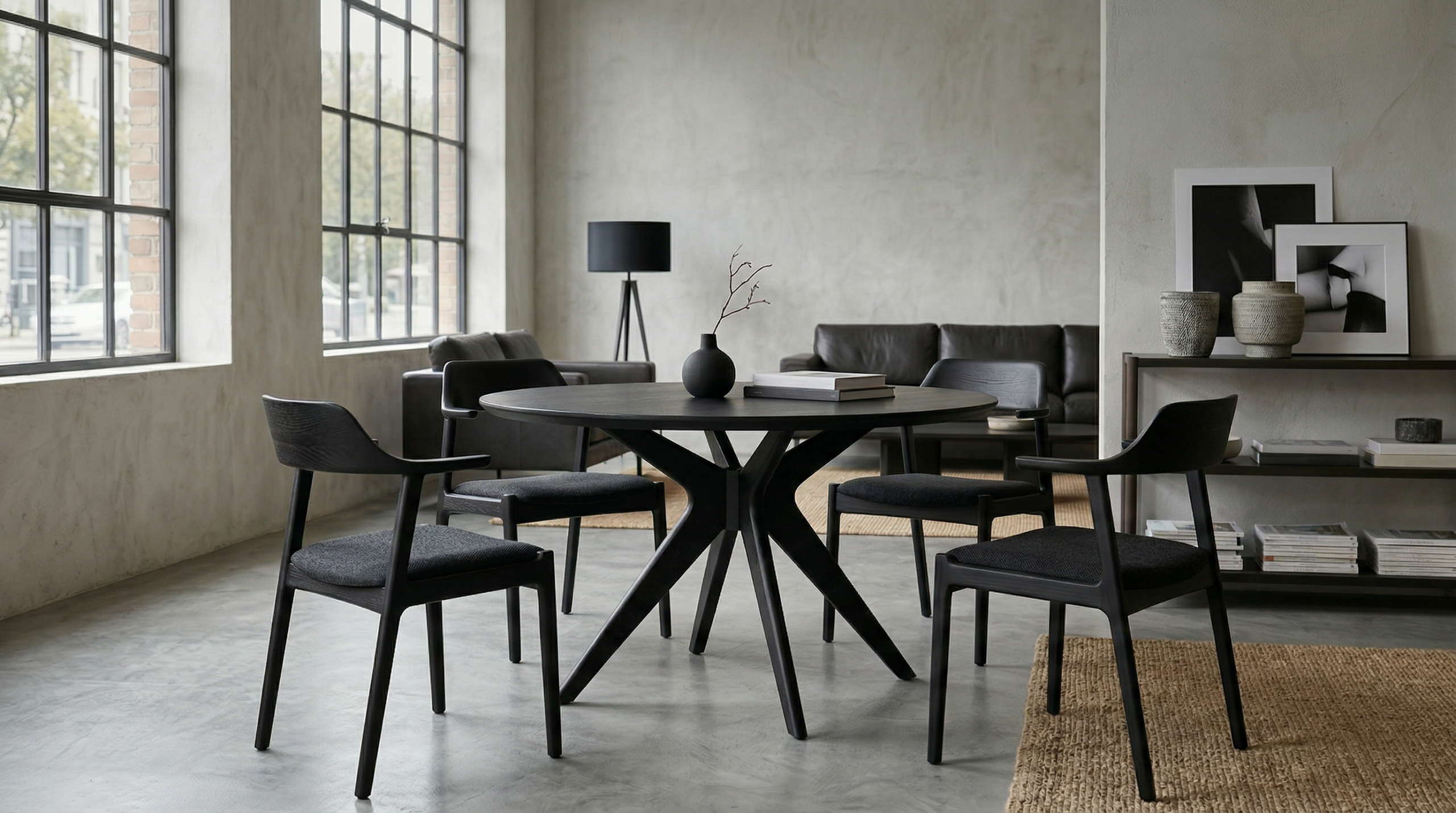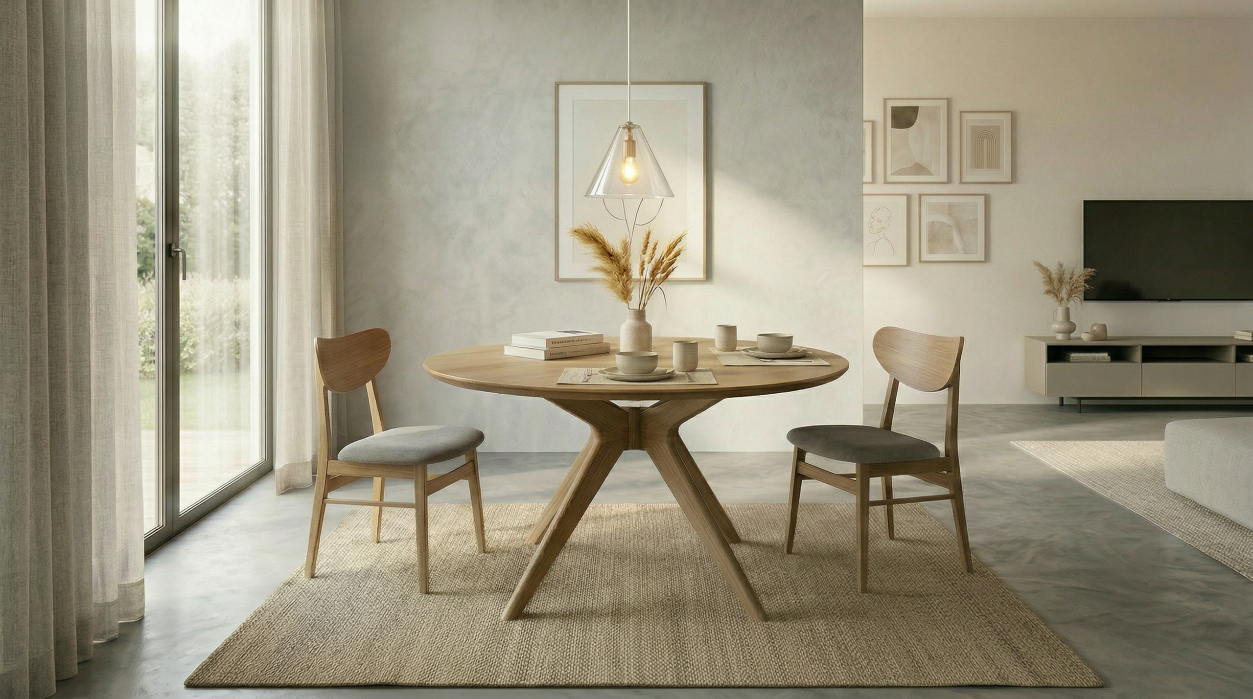 4本脚の構造で、安定感を保ちながらも空間を広く見せるスタイリッシュな円テーブルです。天板は底が船底カットになっており、サイズが大きくても野暮ったく見えないデザインです。