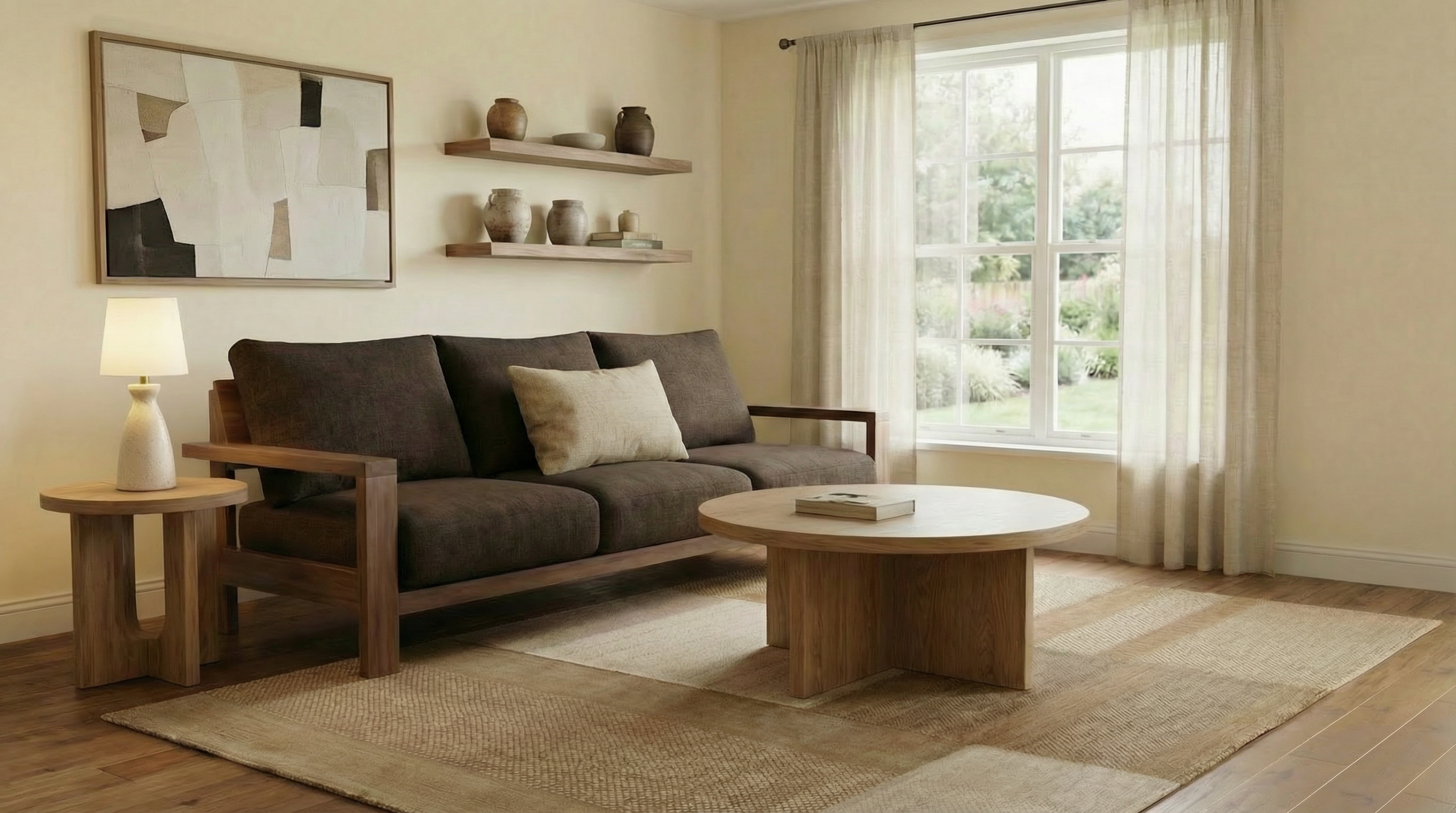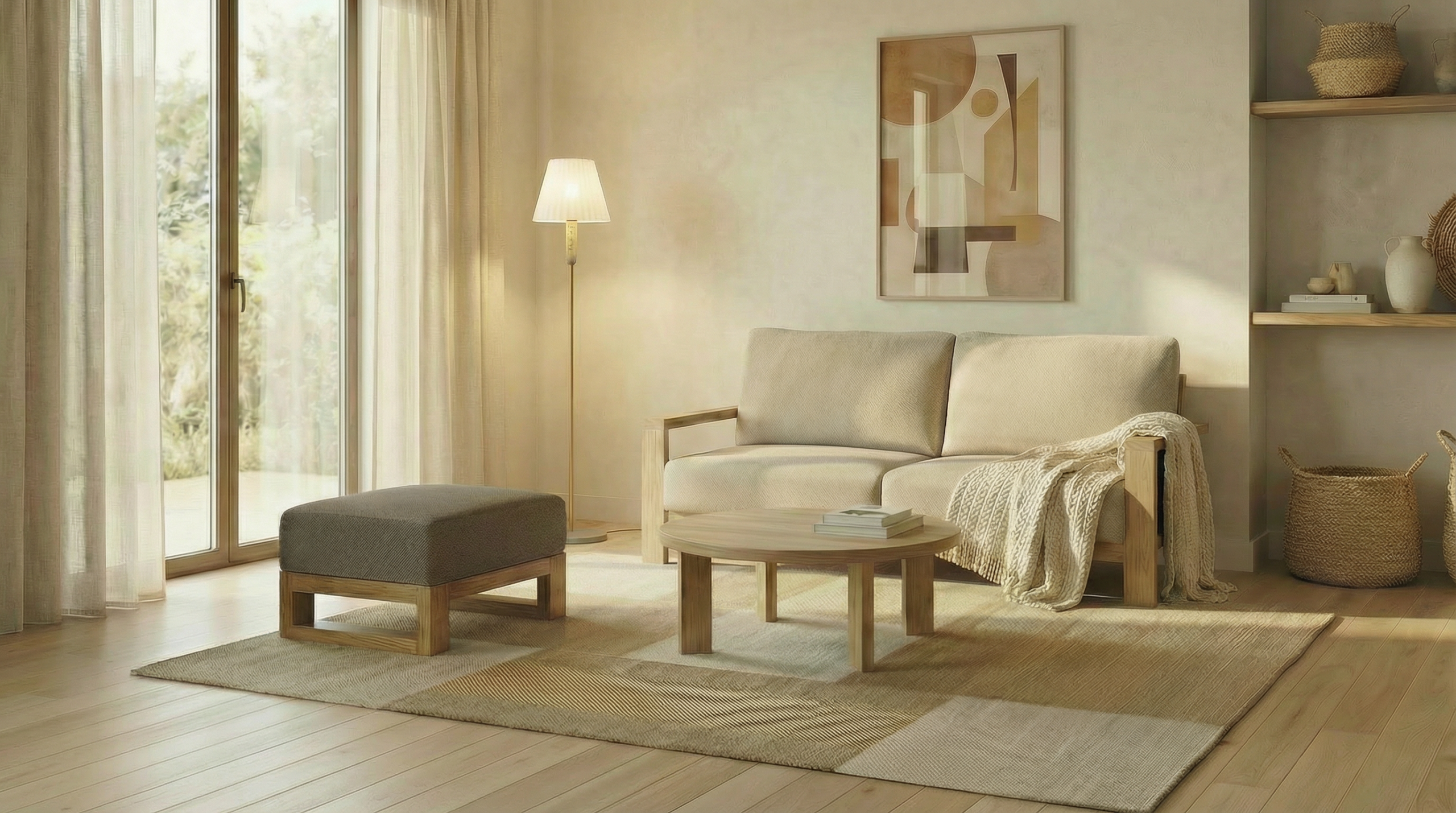 Firefly_モダンナチュラルテイストのリビングにレイアウトした画像を作って_植物を消して_絵のデザインを変更して_フロアランプを追加して 492303
